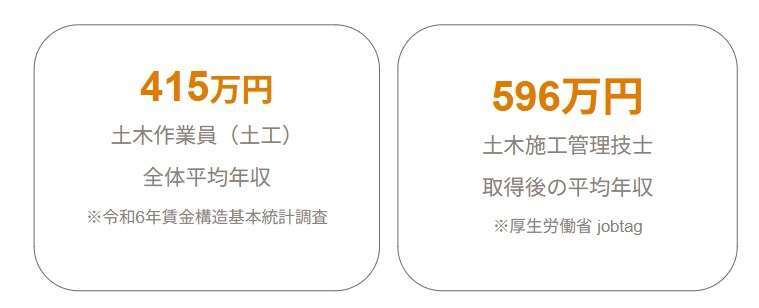 資格の有無で、任される仕事も年収も大きく変わります。たとえば現場作業を担う土木作業員の平均年収約415万円に対し、現場をまとめる土木施工管理技士では、約596万円の水準も見られ、差額は約180万円となります。
