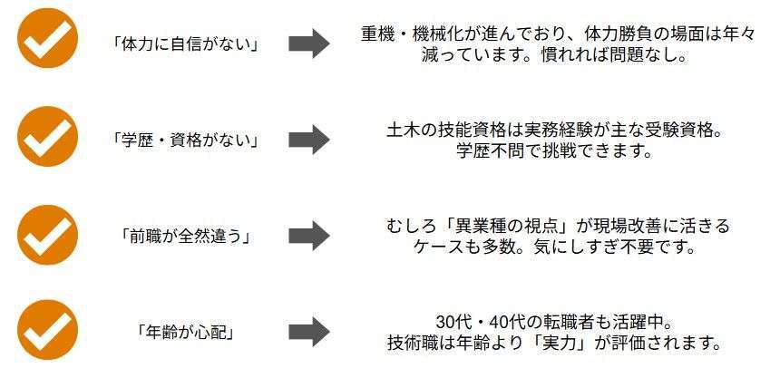 また、異業種経験は、決して無駄になりません。接客業で培った対人対応力、製造業で身についた正確さ、営業職で磨いた調整力なども土木の仕事で役立ちます。