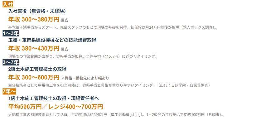 ただし、この数字はあくまで平均値です。土木業界では、現場経験を積んで任される仕事が増えるほど収入が上がりやすく、資格取得によって年収差も大きくなります。初年度の数字だけで将来性を判断しにくい業界です。