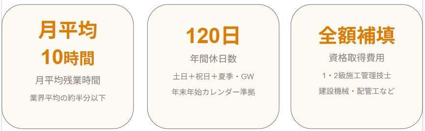 建設・土木業界には「残業が多い」という印象を持つ方もいるかもしれません。加藤土建では、月平均残業10時間以内を目安に、仕事と私生活を両立しやすい環境づくりに取り組んでいます。