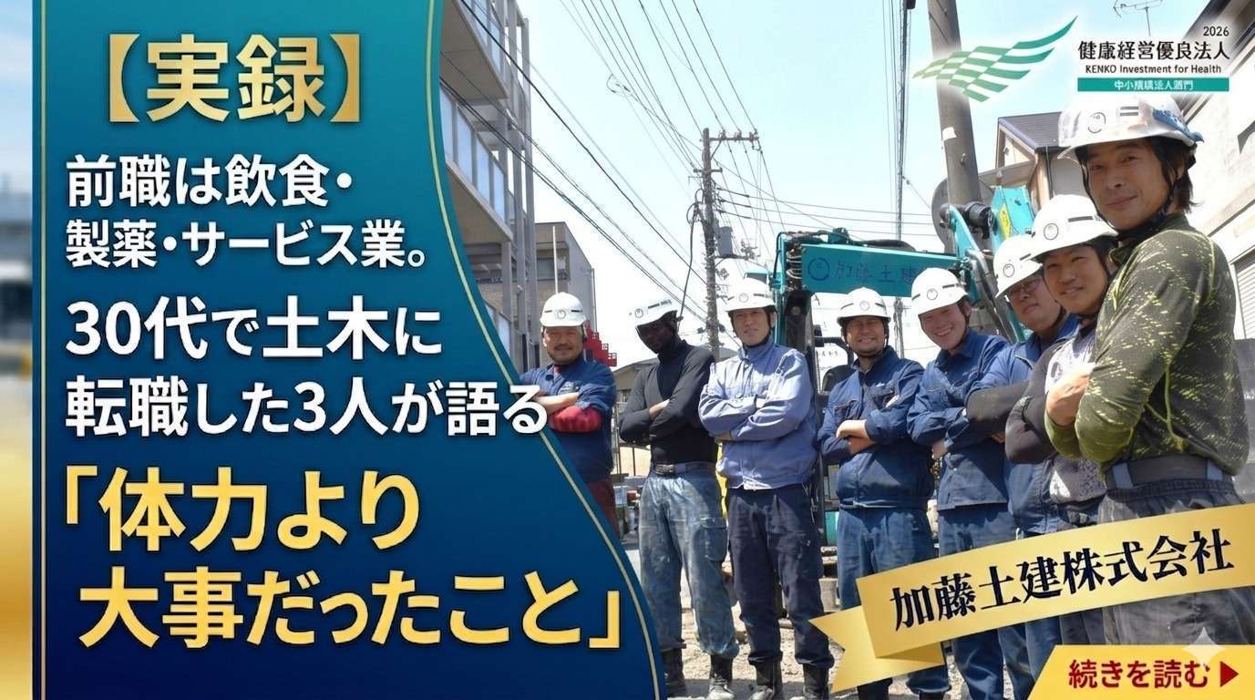 一方で、「体力的にきつそう」「未経験の30代では遅いのでは」と不安を感じる方もいるでしょう。けれど実際には、飲食業や製薬会社など別業界から転職し、キャリアアップして活躍している人たちがいます。今回は神奈川県川崎市で地域インフラを支えてきた加藤土建株式会社で働く3人のリアルな声をもとに、30代未経験でも土木転職が現実的な選択肢である理由をご紹介します。