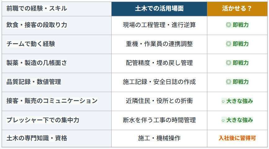 ■前職スキル対応表。あなたの経験は土木で活きる!