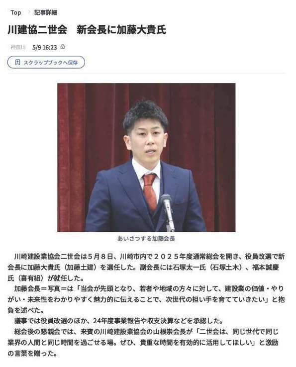 この度、弊社代表社員の加藤 大貴が川崎建設業協会二世会の新会長に就任しましたので、ご報告いたします。