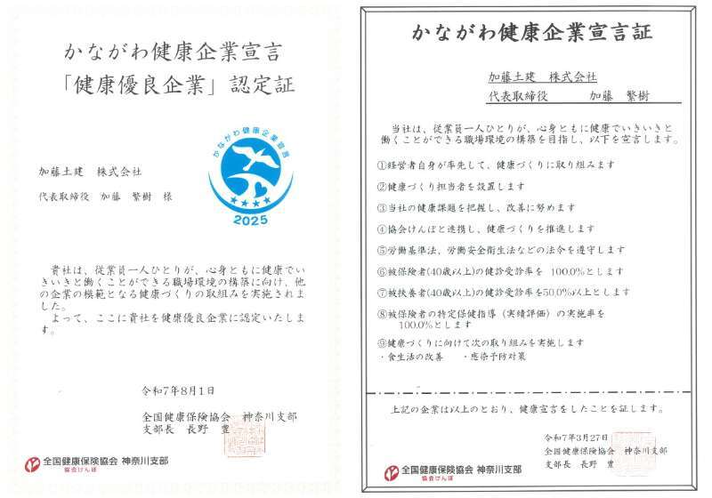 加藤土建株式会社は「人こそが最大の資本であり、持続的な企業の成長の源泉である」との考えのもと、すべての社員が心身ともに健康で、いきいきと働き続けられる環境づくりを推進します。